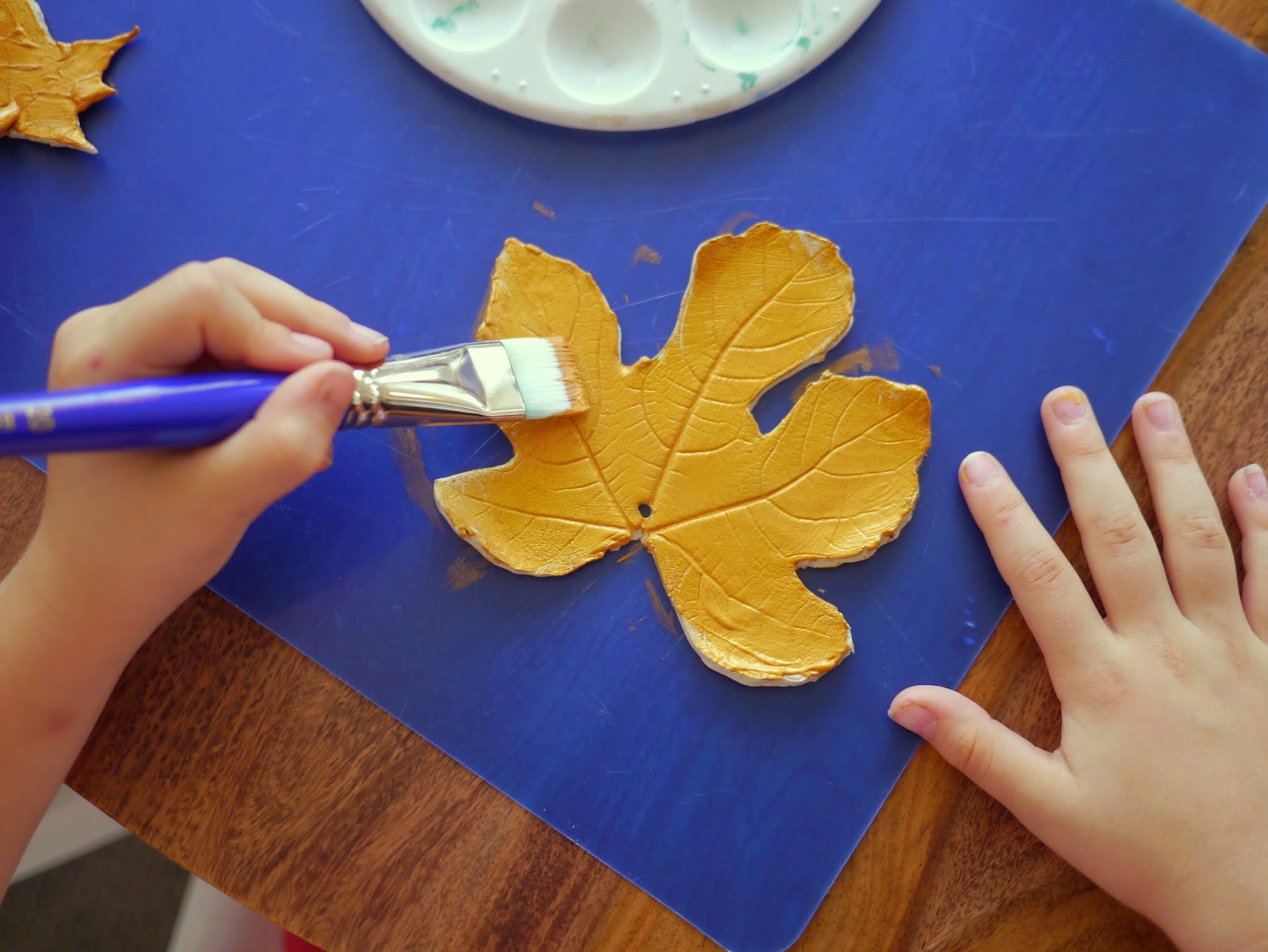 If you'd like to hang your clay leaves tie a ribbon or string through the hole once the paint has dried.